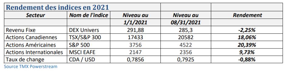 Voici notre tableau qui résume le rendement des principaux indices boursiers depuis le début de l’année 2021. Selon Morningstar, la moyenne des portefeuilles de gestion équilibrée (considéré à risque moyen), comprenant 50 % de revenus fixes (obligations) et 50 % d’actions, a ainsi généré un rendement moyen de +8,08 % au 31 août 2021.