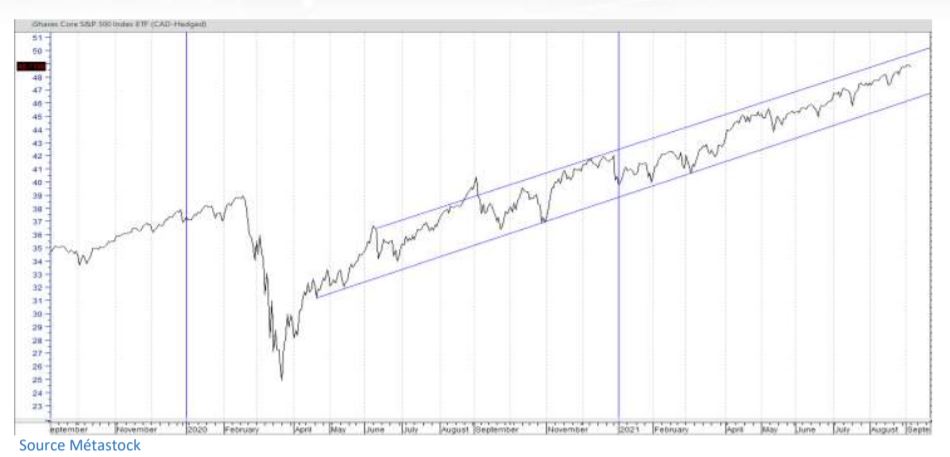 Nous pouvons constater par les deux lignes en bleu que nous avons volontairement ajoutées au graphique, que nous sommes dans un corridor haussier depuis le mois de mai 2020. Nous assistons en moyenne à une correction de 5 % à 10 % à tous les 12 mois. Nous sommes présentement à 15 mois de croissance consécutifs. Il ne faudrait donc pas se surprendre d’assister à une baisse au cours du prochain trimestre. Cette baisse serait saine et en lien avec les données économiques que nous pouvons observer.
